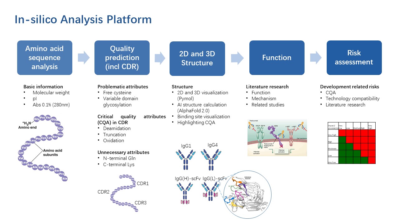 运用多种辅助计算和信息学工具,基于蛋白序列的in-silico分析,能够预测蛋白的潜在风险,如断裂、聚集、翻译后修饰等信息,提供可开发性评估,有助于正确制定药物开发策略。