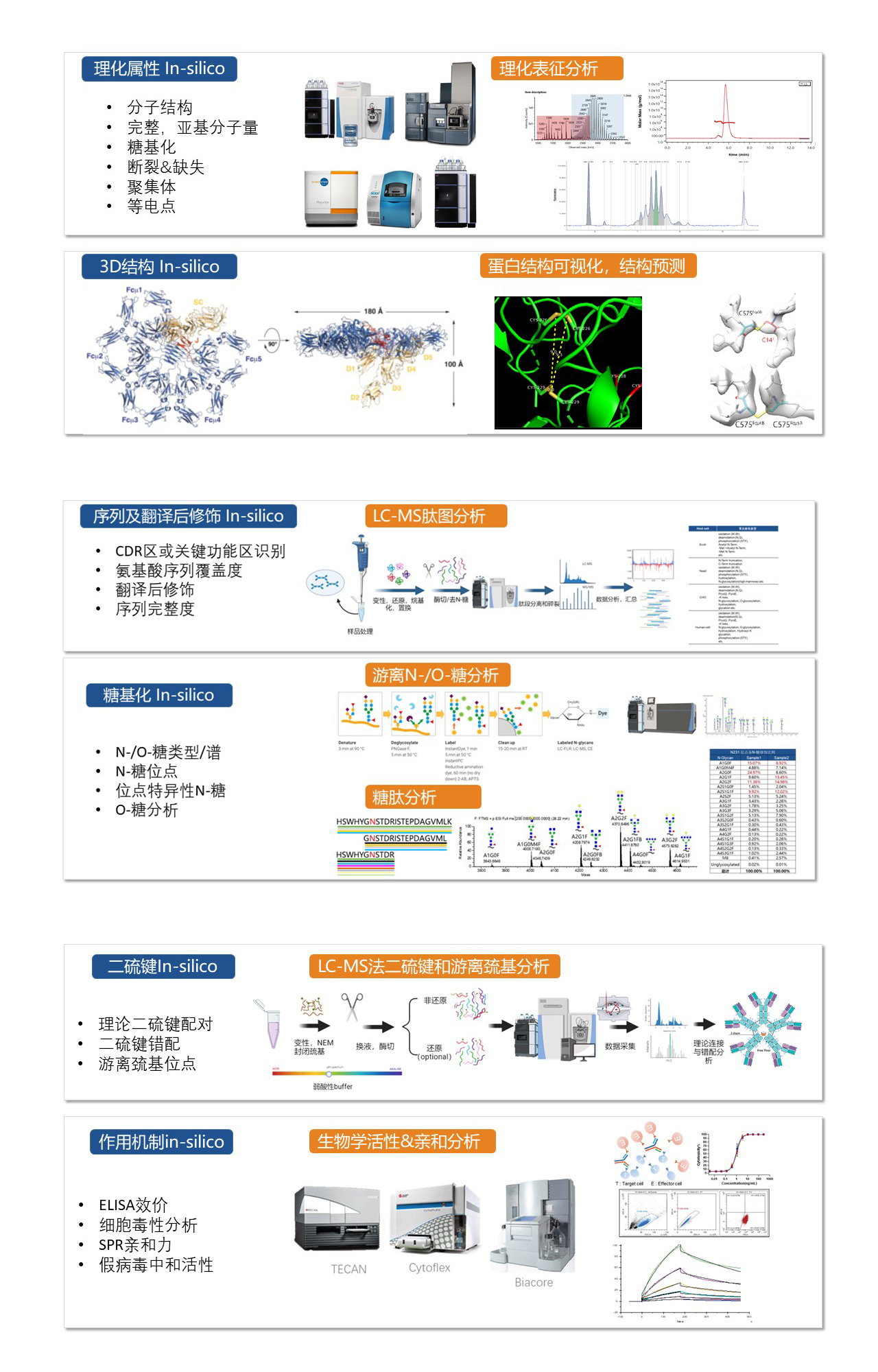 基于序列分析和3D空间结构测量,能够获得蛋白分子量、等电点、消光系数、二硫键、游离巯基、糖基化等信息,进一步对潜在风险翻译后修饰、分子完整性、聚集性、疏水性等属性进行预测。3D可视化能够加深对功能位点和作用机制的深刻理解,结合平台经验,进行风险识别和应对策略评估,此外结构和分子背景的全面科学理解,对上下游工艺,分析方法,制剂开发能提供有力参考。
