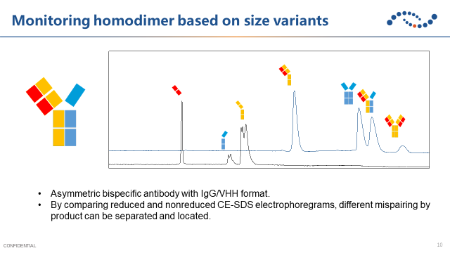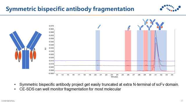 对称性抗体通过链接亚基来实现双特异性,但容易出现共价结合的聚集体或者在亚基上发生的断裂。因此需要在工艺研发过程中重点关注聚集体和碎片,例如使用毛细管凝胶电泳监控碎片。
